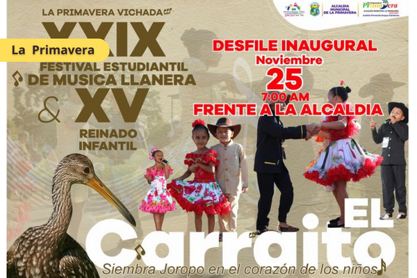 Este sábado 25 de noviembre, a partir de las 7:00 am, La Primavera se llena de magia llanera con un desfile frente a la Alcaldía Municipal que marcará el inicio de esta celebración única. Acompáñanos y sé parte de la emoción.