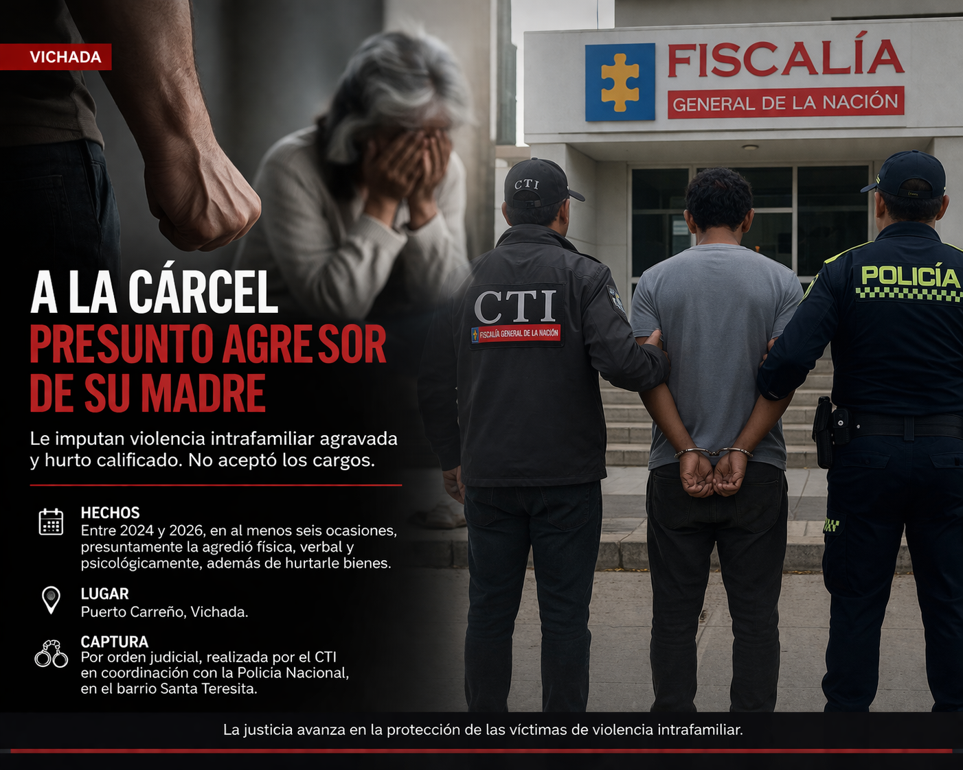 Los hechos habrían ocurrido de manera sistemática entre los años 2024 y 2026 en el municipio de Puerto Carreño, donde, en al menos seis ocasiones, el presunto agresor ingresó a la vivienda de la víctima para sustraer productos de mercado, materiales de construcción y otros elementos de valor. Asimismo, se le atribuyen constantes agresiones verbales y amenazas de muerte, presuntamente realizadas con armas cortopunzantes.