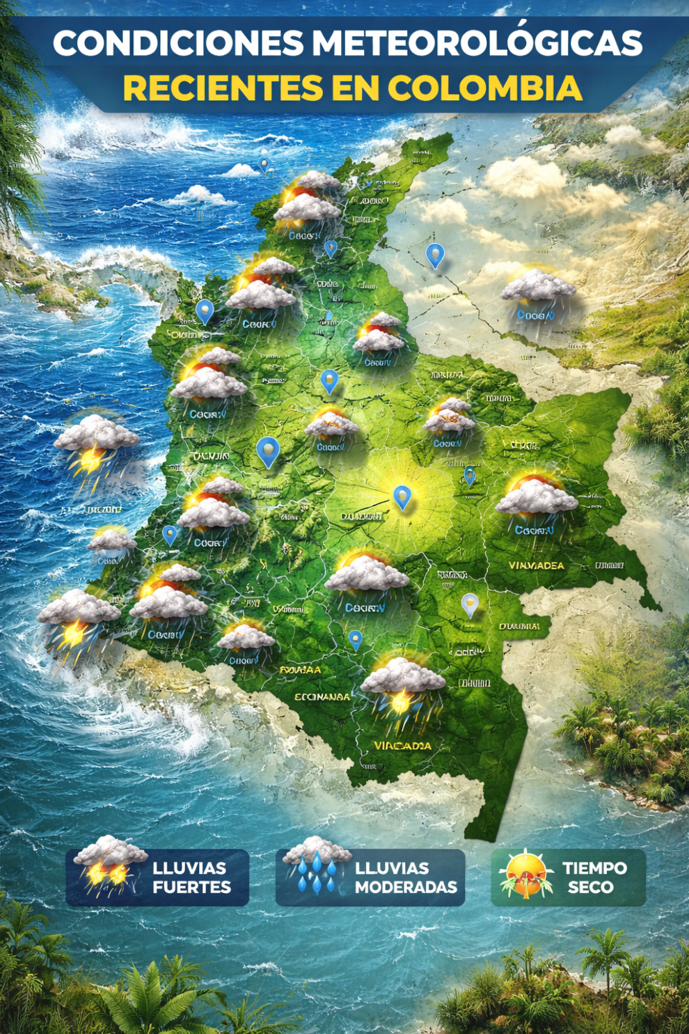 En amplios sectores de las regiones Pacífica, Andina, Orinoquía y Amazonía, se han presentado lluvias de diversa intensidad, algunas de ellas acompañadas de tormentas eléctricas. Las precipitaciones más significativas, entre moderadas y fuertes, se concentraron especialmente sobre el litoral del Pacífico colombiano —tanto en zonas marítimas como costeras— así como en áreas del centro y norte de esta región.